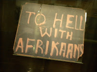 ...and I wondered, if the blacks are this excited about my tee shirt, what will the whites, specifically the Afrikaners, think? Hmmm... well it didn't take me long to find out. I enjoyed my breakfast and the celebrity status my tee shirt granted me. It was almost time to leave for our daily adventure, and I needed to run upstairs and grab my camera. On my way down the stairs from the 3rd floor, a group of 4 young, blonde haired Afrikaner males exited the gym on the 2nd floor, and were perfectly positioned to get a bird's eye view of the back of my tee. What I heard next was a grumbling of angry words from one of them in Afrikaans. Some words sound the same in every language... so I slowed my gait, squared my shoulders, and stopped...